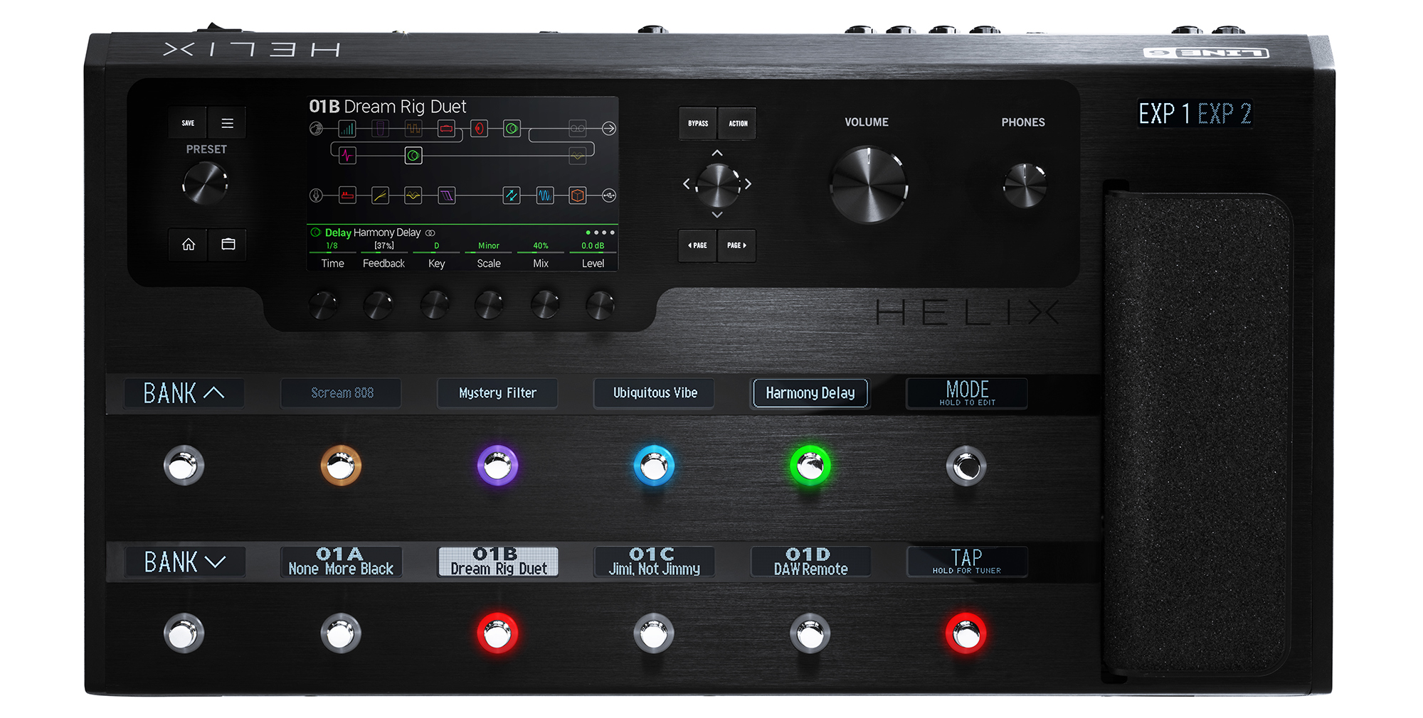 6.2インチの大型LCDディスプレイとタッチセンシティブ・フットスイッチを採用し、高い操作性を実現しました。フットスイッチのカラーLEDリングとカスタマイズ可能なスクリブル・ストリップによって、各フットスイッチの割り当てが一目でわかるインターフェースとなっています。またペダル・エディットモードでは、編集したいブロックを選択するだけで、そのパラメーターがフットスイッチに反映され、エクスプレッションペダルでの調整が可能となります。